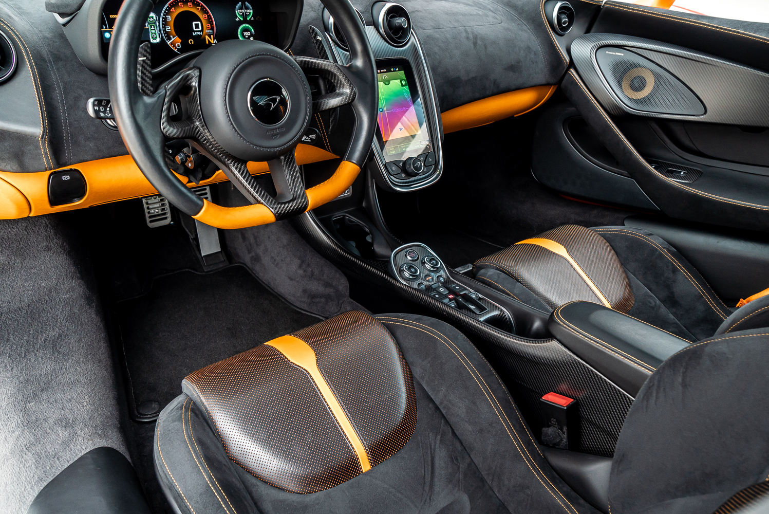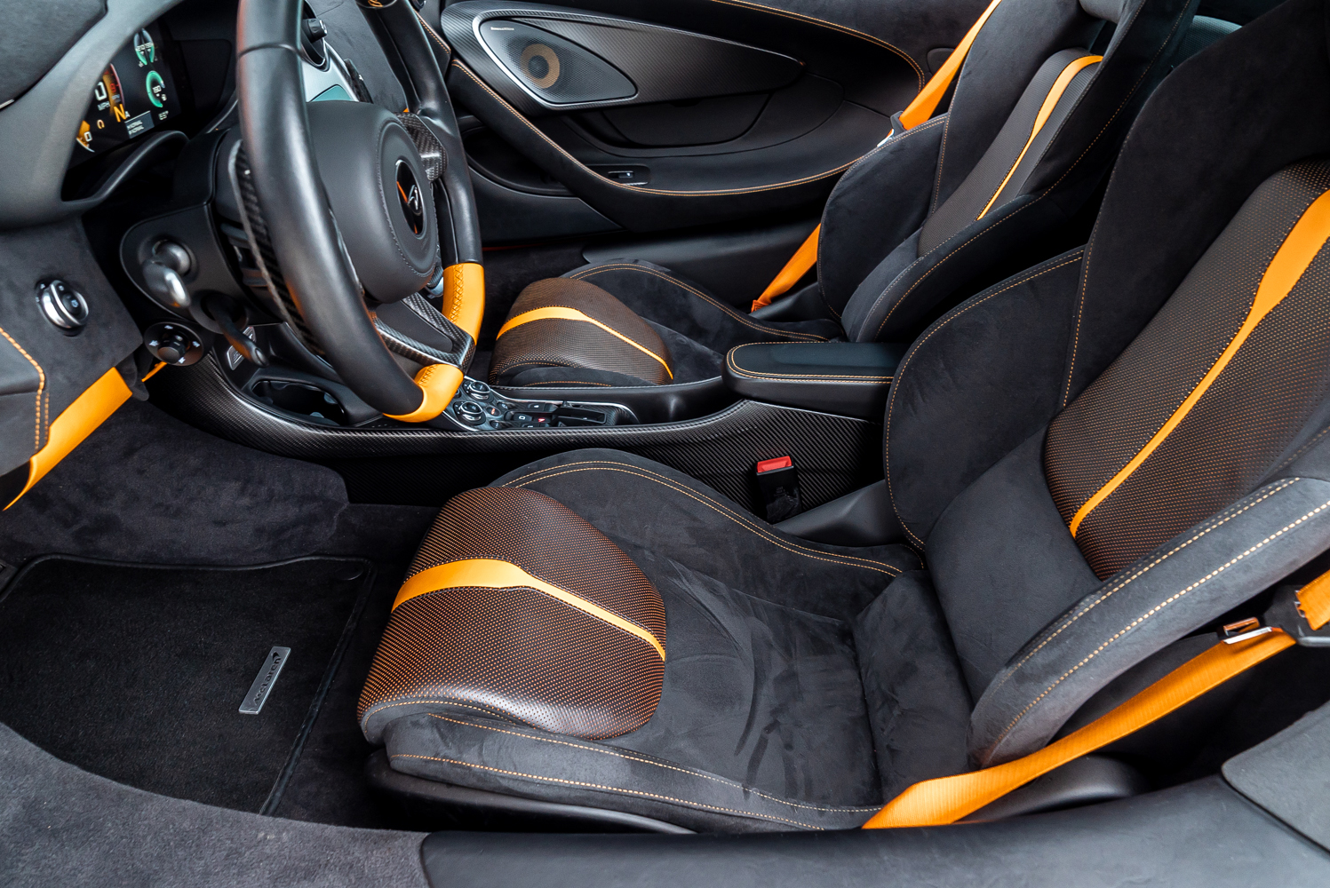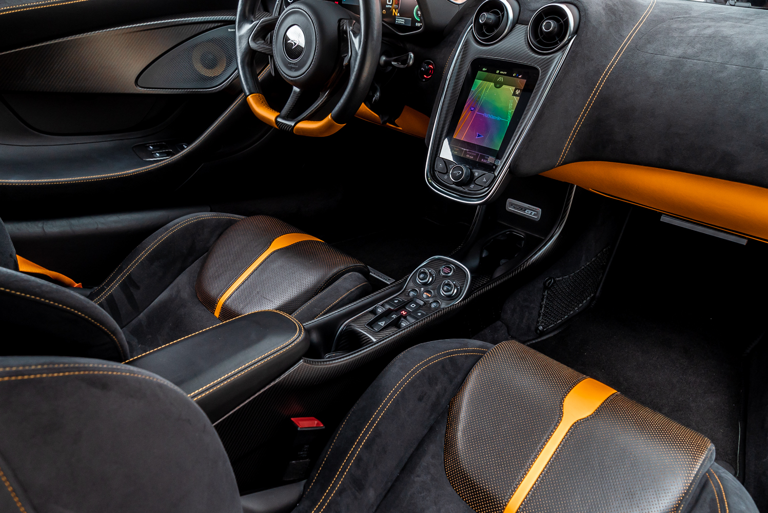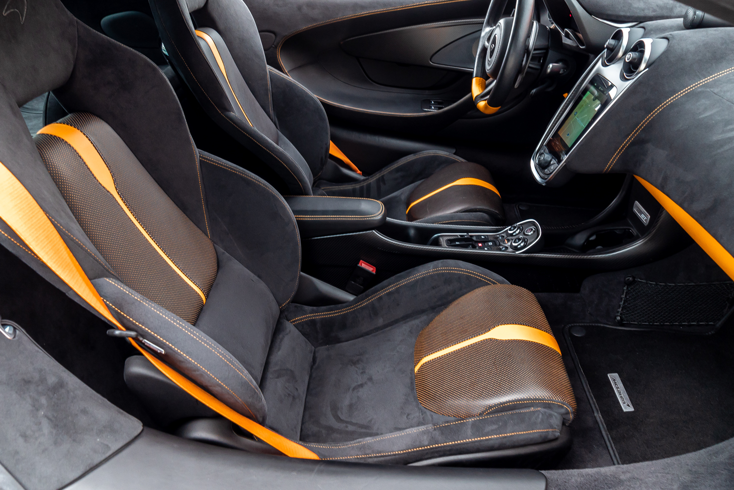 - Full black leather interior with orange contrast stitching