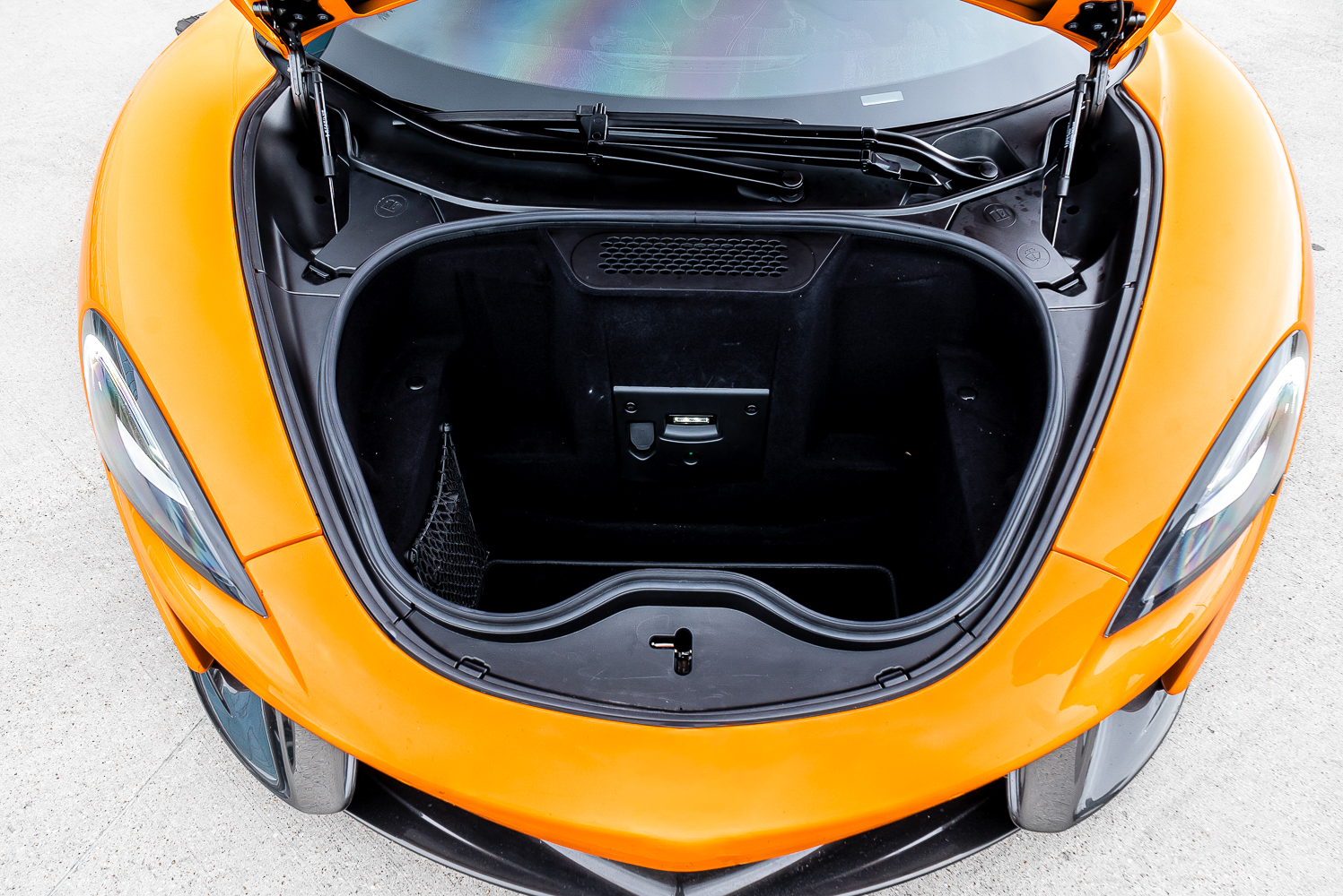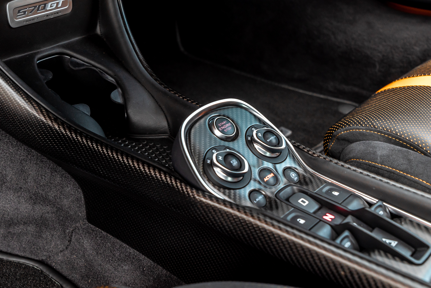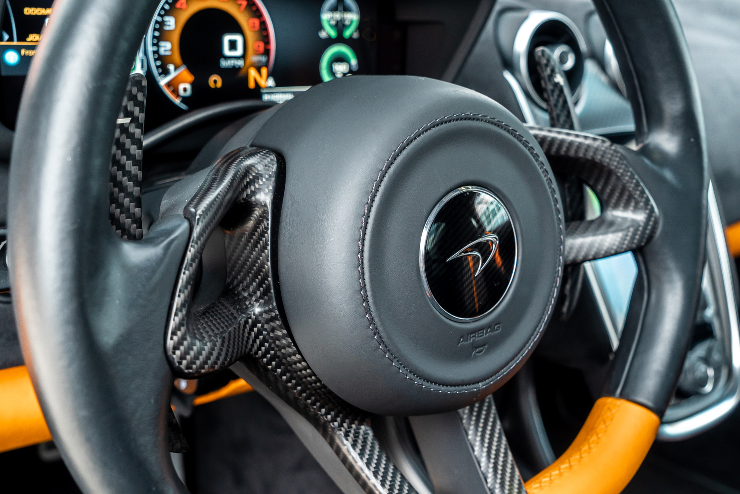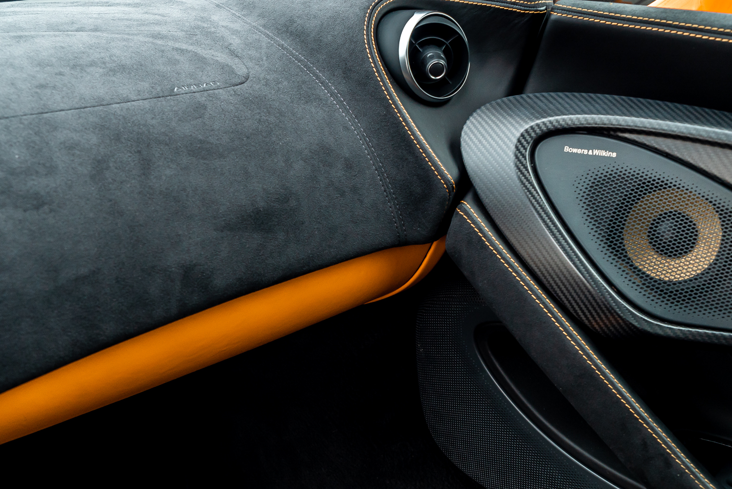 - Full black leather interior with orange contrast stitching