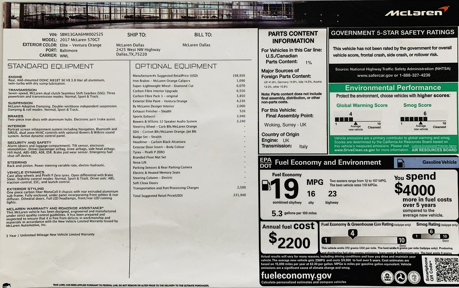 Original MSRP $232,000 (Monroney label shown below)