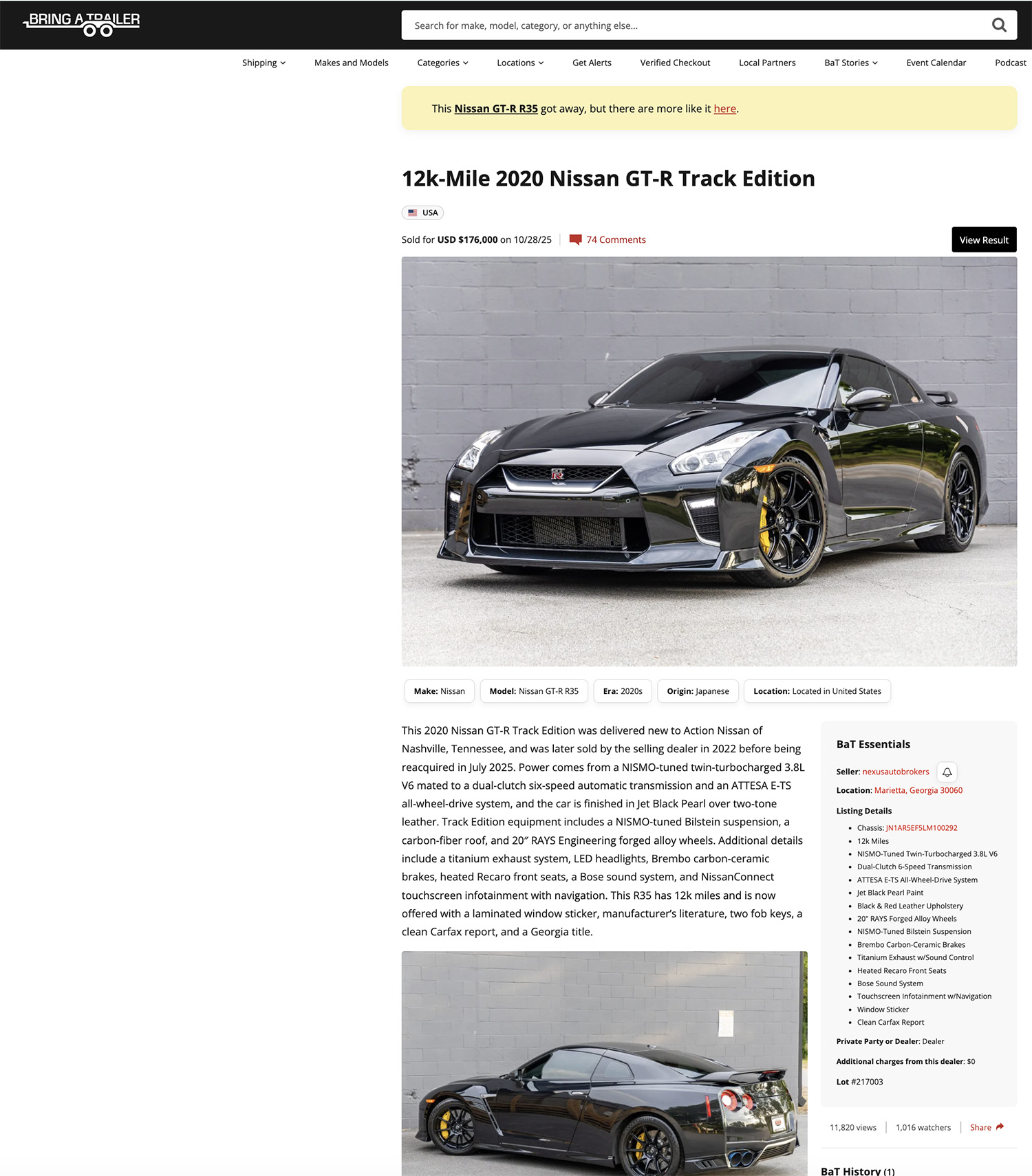 Recent exact comp on Bring A Trailer sold for $185k after fees (shown below)