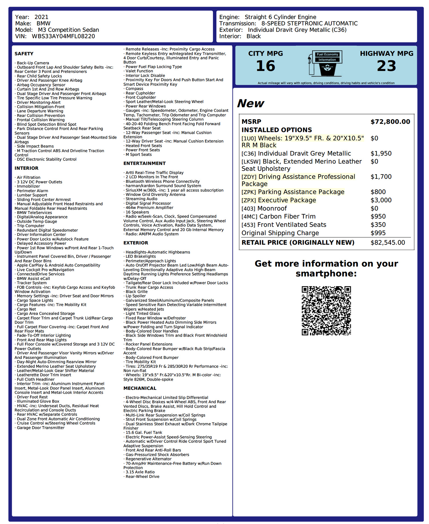 The 2021 BMW M3 Competition is the perfect blend of exhilarating performance, precision engineering, and timeless luxury. Powered by a twin-turbocharged 3.0-liter inline-six engine, it delivers a heart-pounding 503 horsepower and 479 lb-ft of torque, propelling the M3 from 0 to 60 mph in just 3.8 seconds. With its razor-sharp handling, advanced adaptive suspension system, and rear-wheel or available all-wheel drive, the M3 Competition offers an ultra-responsive driving experience that feels like an extension of your own instincts. Whether you’re conquering the open road or carving up twisty corners, this M3 is built to make every moment behind the wheel unforgettable.