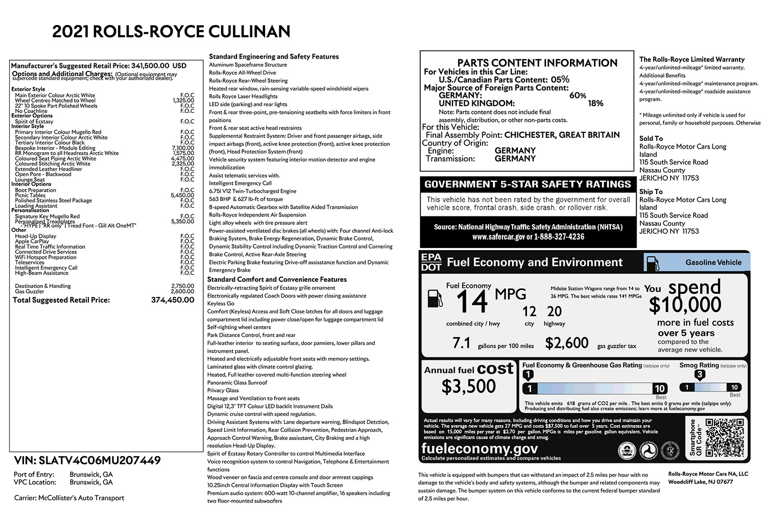 This beautiful arctic white Rolls Royce Cullinan is the pinnacle of luxury. With only 3k miles it is in mint showroom condition! This Cullinan has one of the highest MSRP sticker prices you will find anywhere. It has every desired upgrade including the full Mansory carbon fiber widebody kit and one of the rarest and highest coveted color schemes available. It will not disappoint and comes with the following specifications: