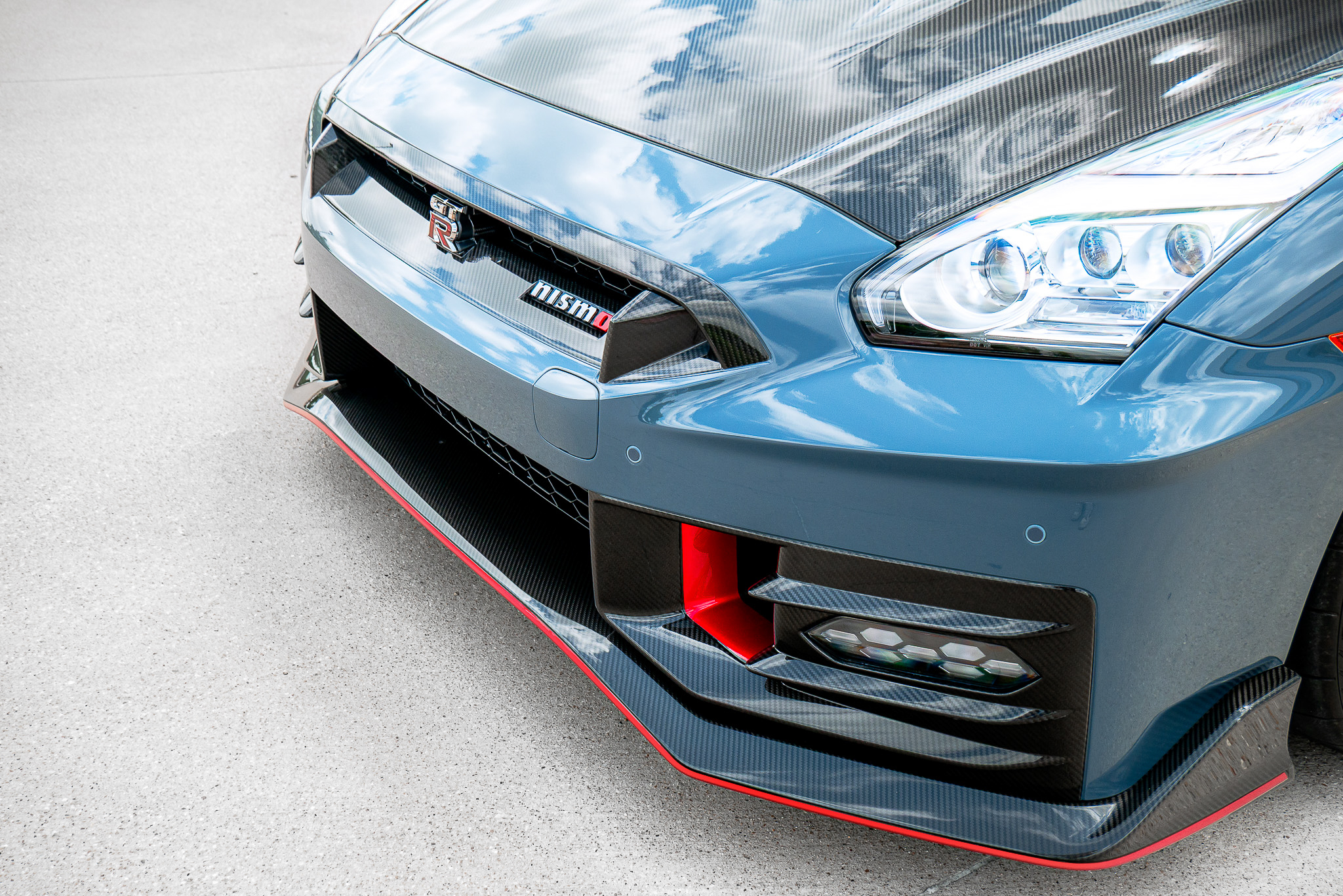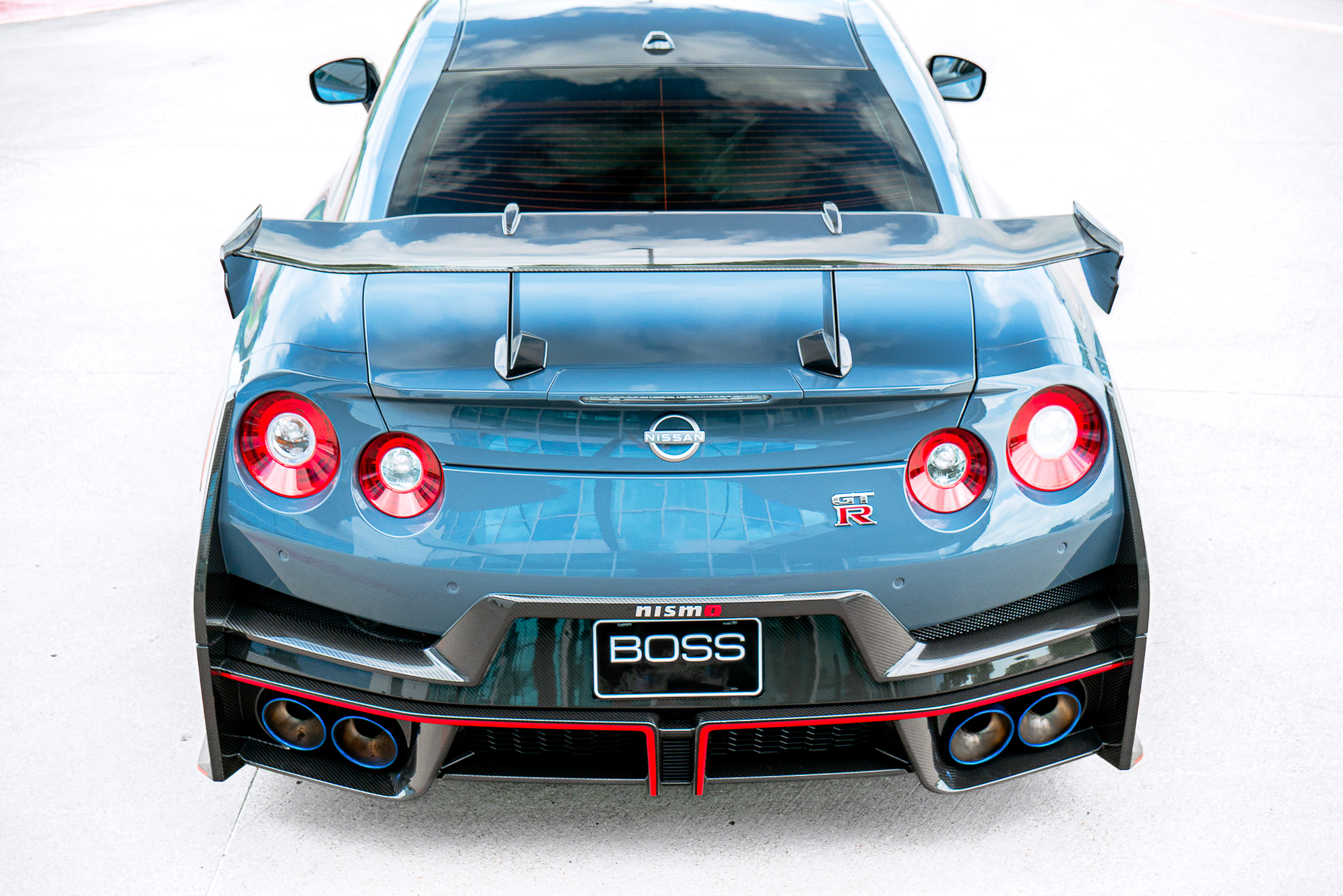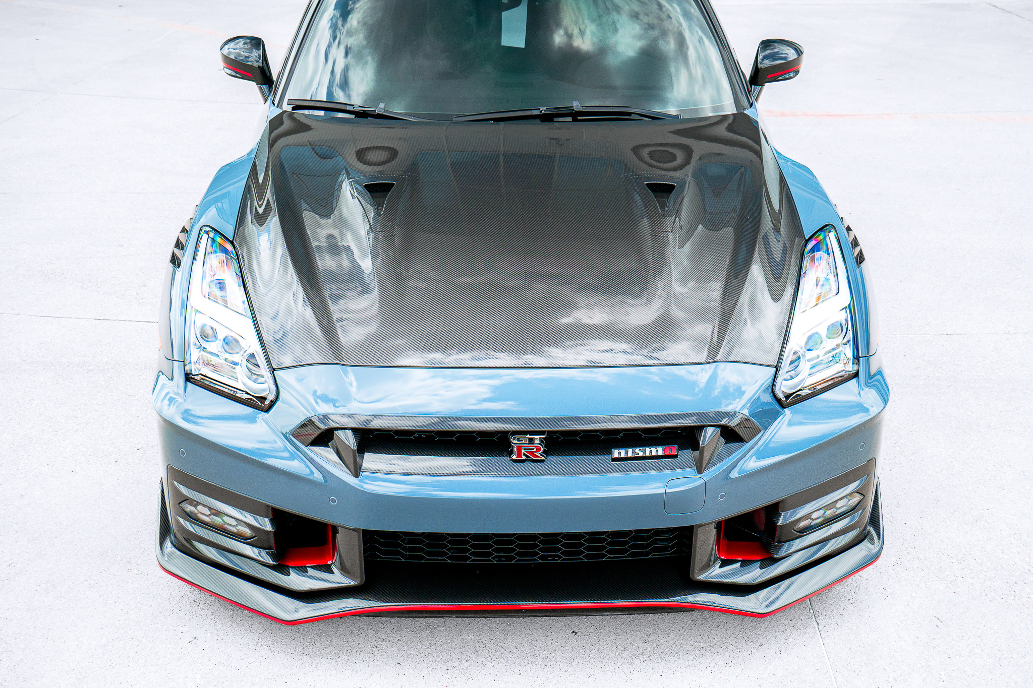 The GT-R NISMO's exterior is a testament to aerodynamic efficiency and aggressive styling. Extensive use of carbon fiber on components like the hood, roof, trunk lid, and aerodynamic elements reduces weight and lowers the center of gravity, enhancing handling dynamics. A newly designed rear wing, mounted on swan neck-style supports, increases downforce by nearly 10%, optimizing stability at high speeds . The optional NISMO Appearance Package adds red-accented RAYS® forged 20-inch wheels, a clear-coated carbon fiber hood, and a unique engine cover design, further distinguishing this high-performance machine .